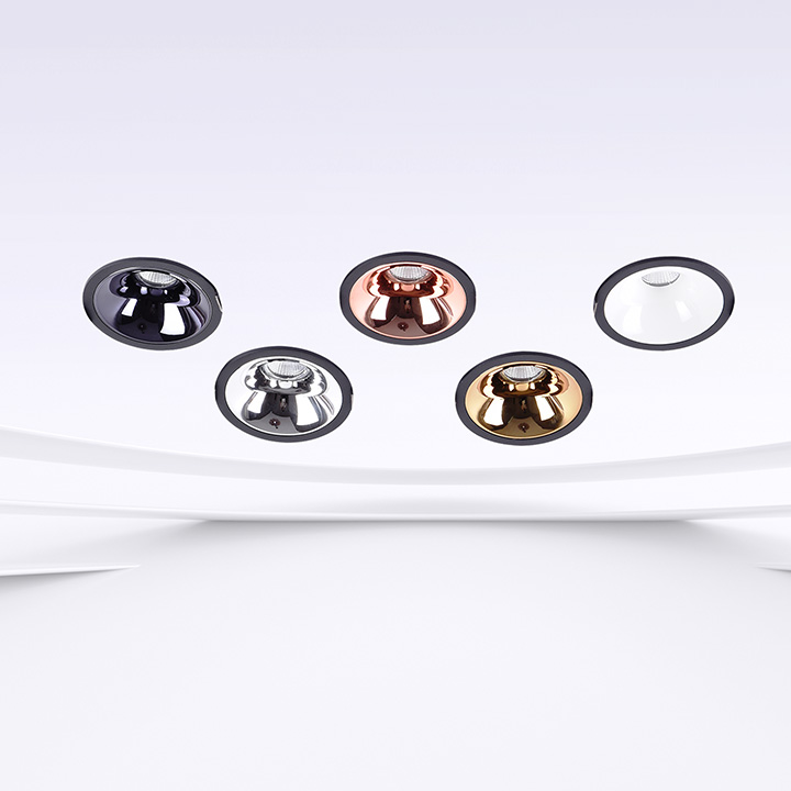 Apparecchio ad incasso per interni, a scomparsa per controsoffitti in gesso, telaio in alluminio. LED COB ad alto rendimento. Disponibile a 7W, 12W, 18W e varie colorazioni , CRI 90, lente 36° - Dimensioni per 7W: diam. 70xh55mm - Dimensioni per 12W: diam. 85xh65mm - Dimensioni per 18W: 90xh80mm. Colorazioni interne disponibili: Bianco, Cromo, Nero, Oro, Rame