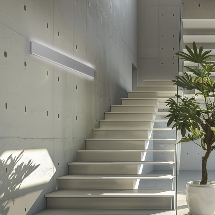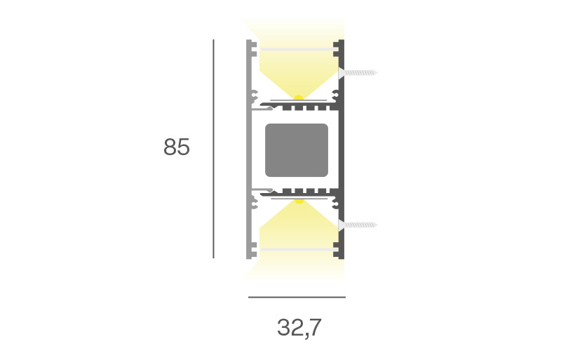 Profilo in alluminio a emissione bilaterale per installazione a parete, con alloggio interno predisposto per inserimento driver. Disponibile in barre da 33 o 52cm, a richiesta altre lunghezze, e in varie colorazioni e tonalità luce