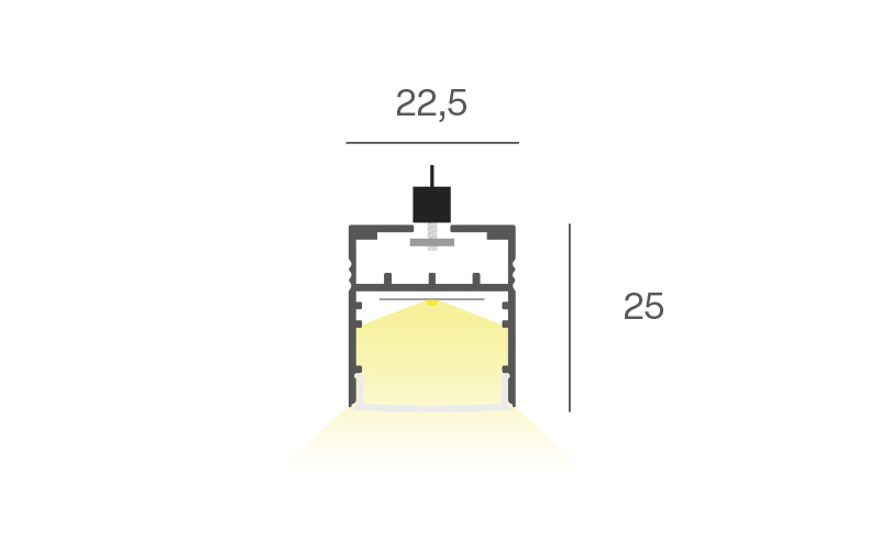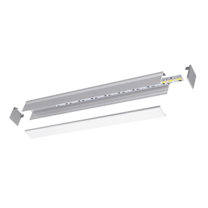 Profilo in alluminio per installazione a parete o in sospensione. Disponibile in barre da 20cm a 2mt, in diverse colorazioni e tonalità luce