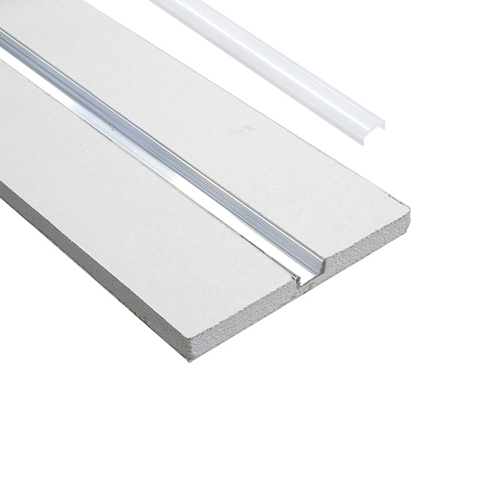 Profilo in cartongesso lineare 2 mt con diffusore opale. Larghezza totale 126mm, incavo 12,4 mm. Può essere fornito nella versione standard, Idopellente o Ignifuga. Il kit comprende profilo, gomma per stuccaggio e cover. Il profilo puiò essere completabile con gli accessori giunto croce, giunto a T, giunto a L, giunto Soffitto/Parete. Ideale per essere installato in modo facile e veloce. Una soluzione all-in one salva costi; il gommino integrato permette di rasare il muro senza intaccare il profilo e poi sfilarlo per l'applicazione della striscia e la cover senza rovinare rasatura e pittura.