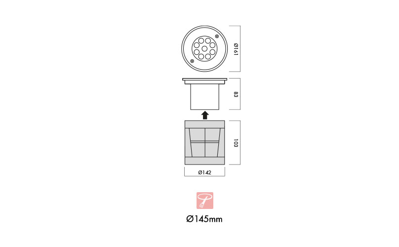 Faro da incasso terra carrabile, corpo in alluminio pressofuso, frontale in acciaio inox AISI304. Uso esterno/interno potenza totale LED 9W. Ideale per illuminare facciate di edifici, monumenti, viali alberati.